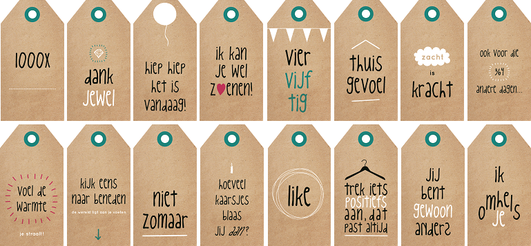 bestaat uit 16 Zin-gevers. De naturelkleurige uitvoering geeft de kadokaartjes een natuurlijke en rustieke uitstraling. Geschikt voor kadowinkels, brocante shops, bonbonneries etc.