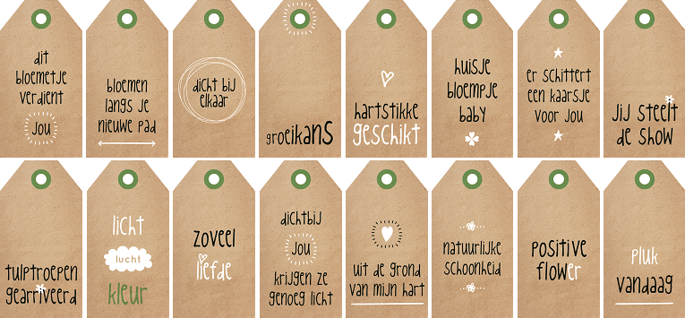 bestaat uit 16 Zin-gevers. De naturelkleurige uitvoering geeft de kadokaartjes een natuurlijke en rustieke uitstraling.